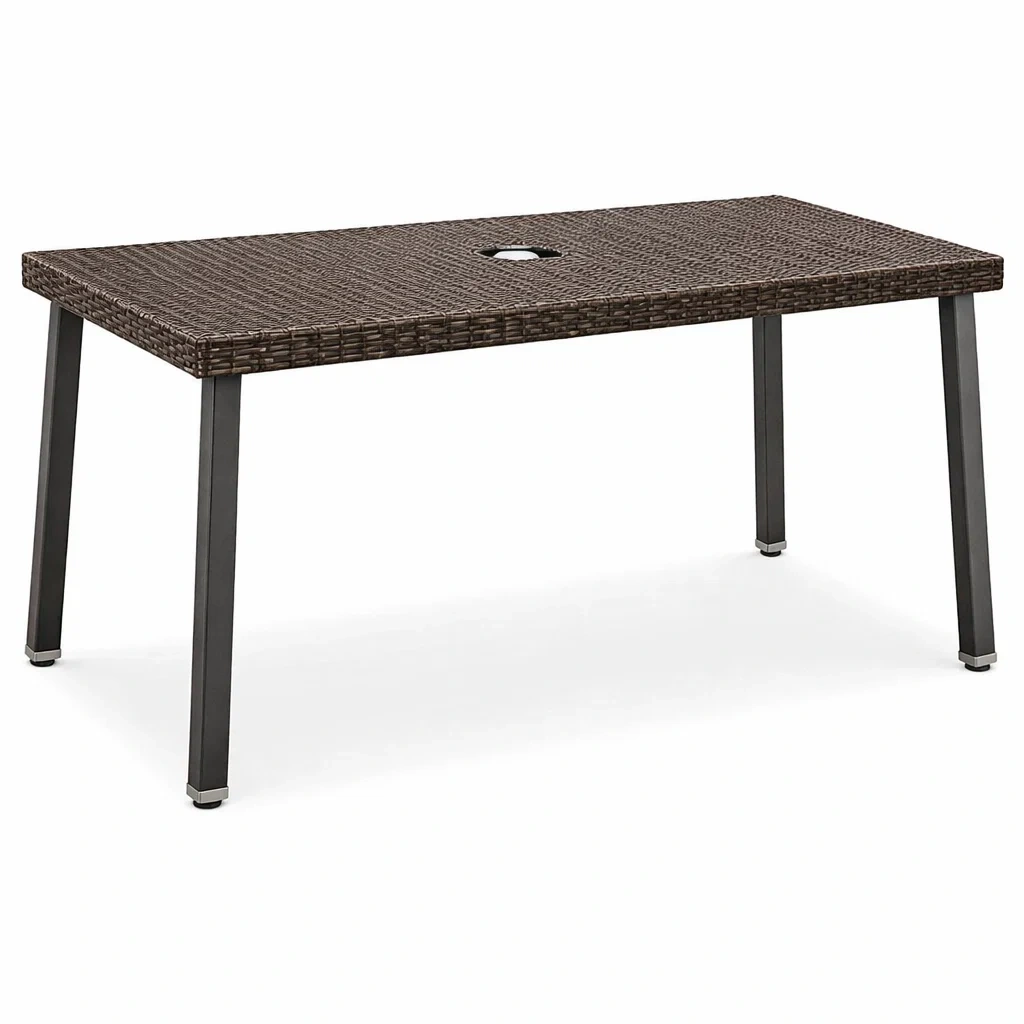 Dieser Tisch besteht aus einem stabilen Stahlrahmen und einer Oberfläche aus PE-Rattan. Er verfügt über ein praktisches Sonnenschirmloch.
