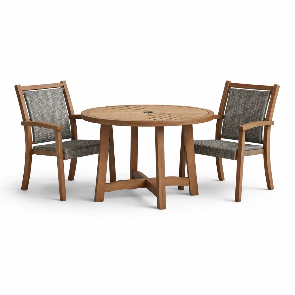 Dieses Set besteht aus einem runden Tisch und zwei Stühlen. Der Tisch besteht aus Eukalyptusholz, die Stühle aus Eukalyptusholz mit Polyrattan-Geflecht.