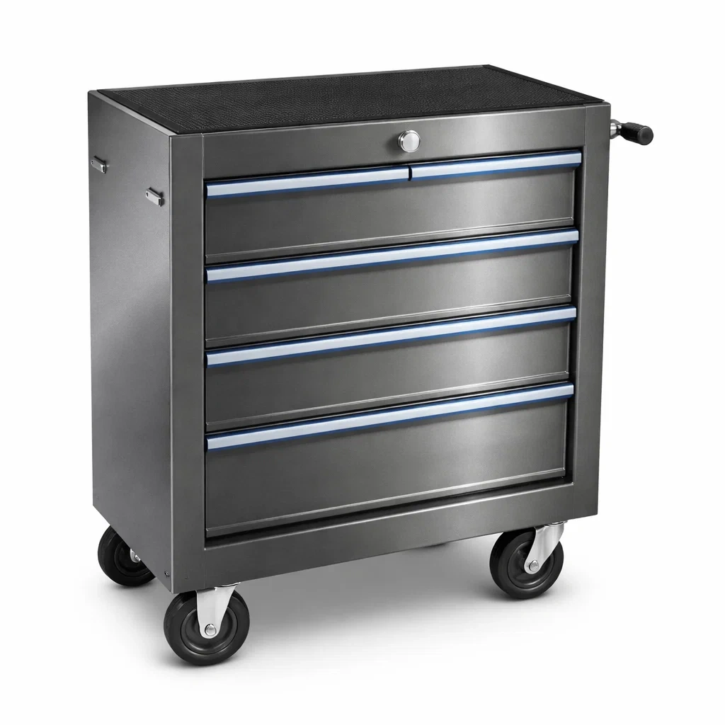 Der Wagen verfügt über 5 Schubladen, Gummiräder und einen zentralen Verriegelungsmechanismus. Die Hauptfarbe ist Grau und die Oberfläche ist glatt.